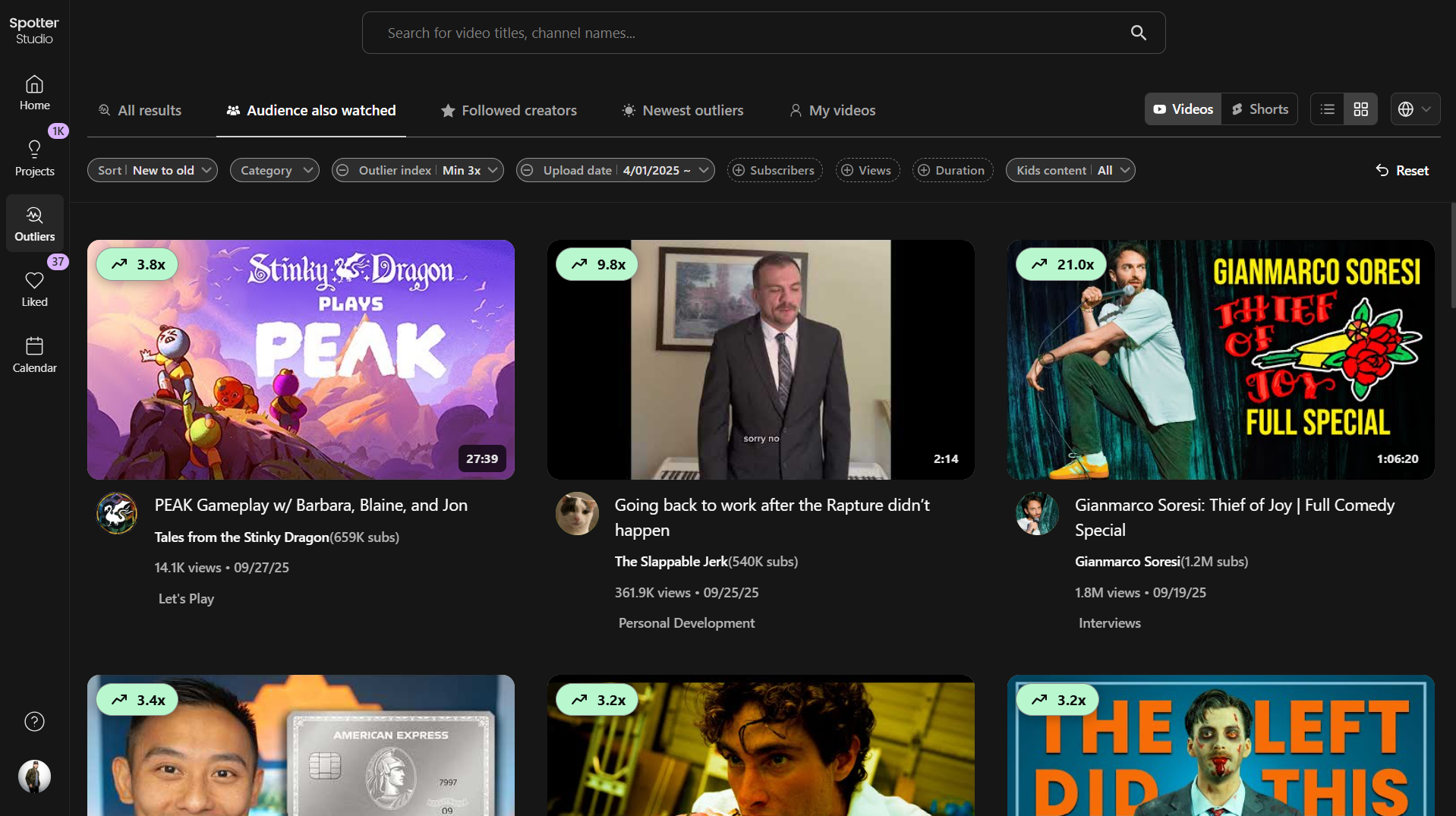 In practice, this means finding videos with unusually high views and asking: Why did this video do so well? Creators look at factors like the topic’s appeal, the thumbnail/title, and audience engagement signals. If they have the excitement and expertise to make a similar version in their own style, they add the idea to their Idea Bank. This outlier analysis can be done manually through Spotter Studio by going to Outliers and Brainstorming off the video to create a video project in your Idea Bank.